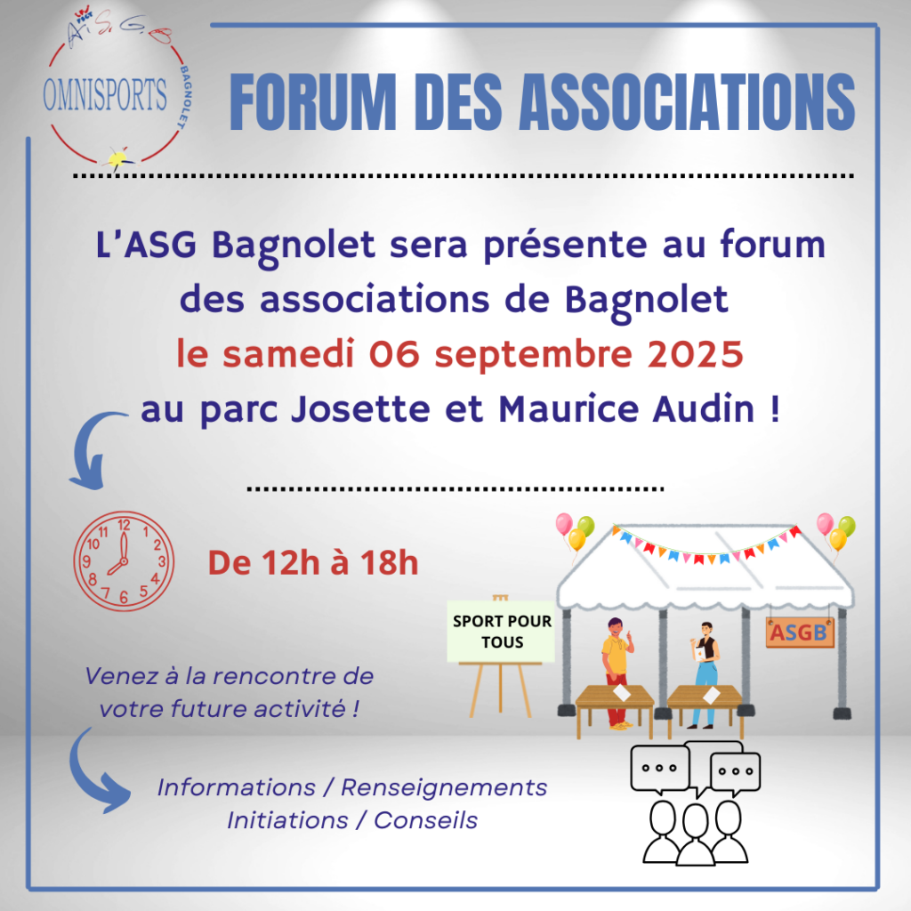 Rendez-vous le samedi 6 septembre pour le forum des associations de Bagnolet ! Venez retrouver l’ASGB et une centaine d’associations bagnoletaise à partir de 12h.